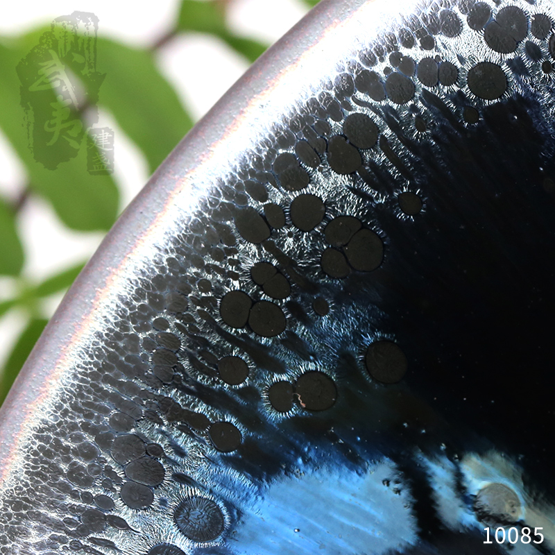 建盏界老一辈工艺师,其烧制的油滴盏,胎土纯正,器型圆润,斑纹饱满,色泽蓝中带银,十分优雅。